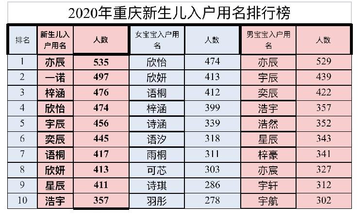 在令人唏嘘的2020年,宝宝的到来给人们带来了新的希望,人们更喜欢用哪些字给新生儿取名呢?近日,重庆市公安局治安总队发布了2020年重庆新生儿入户登记用名排行榜,排名前十位的分别是亦辰、一诺、梓涵、欣怡、宇辰、奕辰、语桐、欣妍、星辰、浩宇。