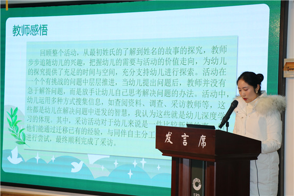 科研室副主任熊淼则从三个关键词进行小结:“相信行动的力量”——“深度学习”理念的落地需要老师们以真实行动大胆践行;“牵好那根线”——牵好主题开展与幼儿发展的线,才能编织出别具意义的主题网络;“成就不期而遇的美丽”——做一位有心人,把握生成活动的价值,进行科学预设,“幼儿的兴趣才能真正变成精彩的课程”。
