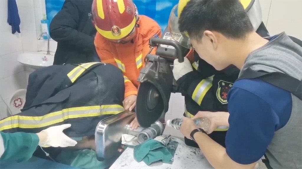 18时15分,消防救援人员赶到医院急诊室,小孩在母亲怀抱中不停哭泣。“天啦,我太大意了,怎么活嘛!”孩子母亲的情绪几近崩溃。消防员一边安抚当事人情绪,一边和医生商量救援方案。小孩的左手被卡在绞肉机进料筒内,绞肉机铁壁较厚,医生无法将绞肉机进料筒从孩子手上取下。
