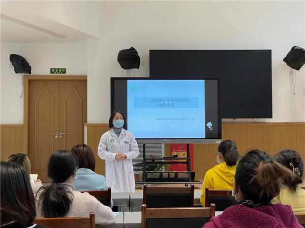 为切实做好幼儿园新学期新冠肺炎疫情防控工作,确保常态化防控工作的有序进行,让卫生保健工作更加规范、科学,保障全体师生的身体健康和生命安全,2月26日,青羊区天府幼儿园锦绣园特邀成都市青羊区草堂社区卫生服务中心黄莎医生开展疫情防控知识宣讲。