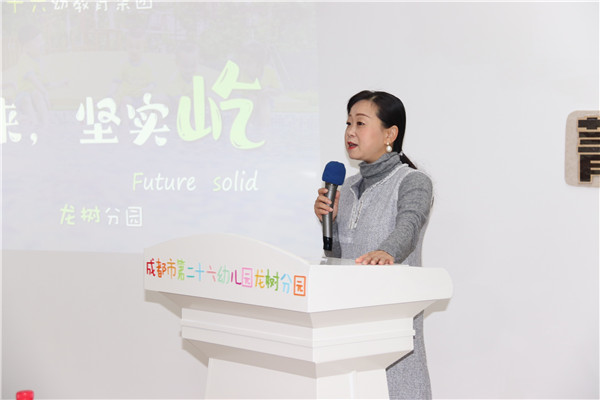 参观结束后,开展了交流研培活动。首先,成都市第二十六幼教育集团副园长、龙树园园点负责人韩露对各位园长和老师表示了热烈地欢迎,并从教育理念、集团规模、园所发展等方面对来访老师进行了介绍。韩副园长指出,龙树园未来三年的发展规划主要为建设园本“悦美”课程,以幼儿发展为目标,设计生成“欣赏、表现、创造”等系列活动。