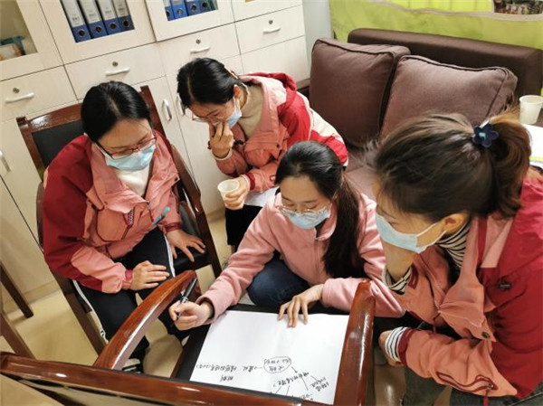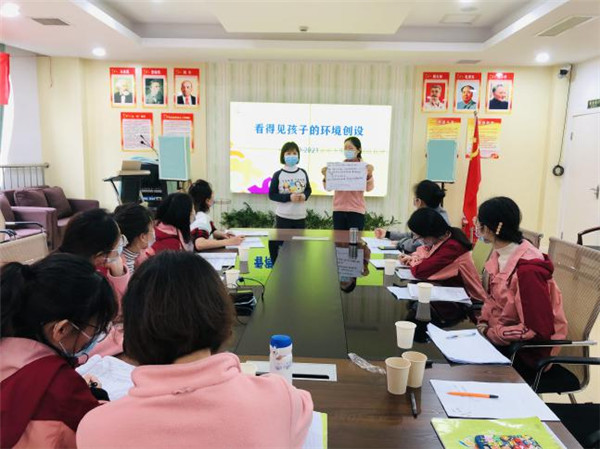 观摩结束后,老师们来到会议室进行研讨交流。通过老师们激烈的研讨,形成了“看得见孩子”的环境创设策略和路径。班级环境应体现幼儿自主学习与生活、参与制作收集材料、根据活动开展逐步呈现幼儿的活动过程、评价(幼儿和环境互动的有效性,教师观察与反思)、家园的配合。