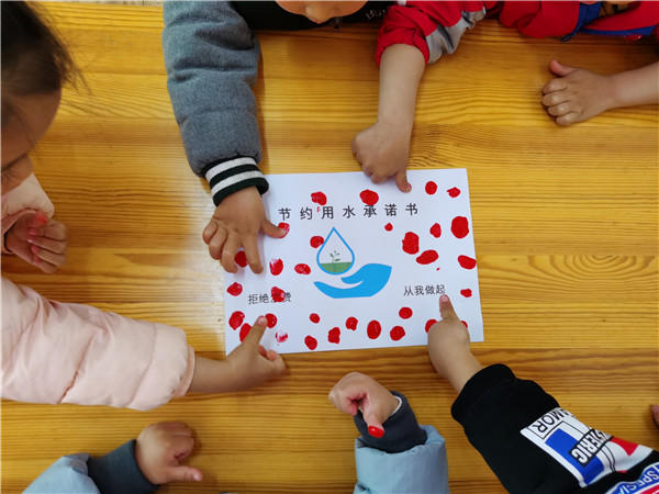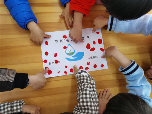 渔桥幼儿园的宝贝们人人争做“护水小使者”,在“节约用水承诺书”上留下满满的红指印。
