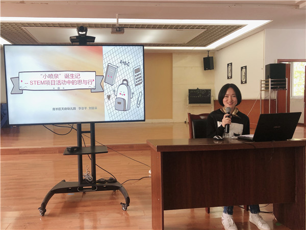 接着,骨干教师李章平为参培学员开展题为《基于STEM项目活动的师生共构教育活动开展的“思”与“行”》的主题讲座。李老师从活动的来源、活动的价值、活动过程和对活动的解读四个方面介绍了开展“小喷泉”STEM项目活动的思与行,为学员讲述了在探究“小喷泉”制作过程中,与班级幼儿共同探索、不断发现问题、解决问题的“教育故事”,并分享了教师在STEM教育中巧妙智慧运用“回头看”的策略,发现问题并及时做出调整和改变的成功经验。