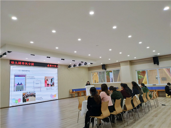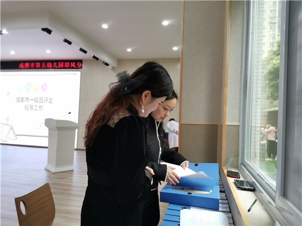 视导组专家首先听取了周倩园长的汇报,通过报告让专家们对五幼培风的园所文化、管理模式、环境建设、教育教学理念等有了深入的了解。随后,专家组对照《成都市幼儿园等级评定办法(2020年修订)》从办园条件、安全卫生、内部管理、队伍建设、保育教育、儿童发展、办园效益等指标内容进行了资料查阅。