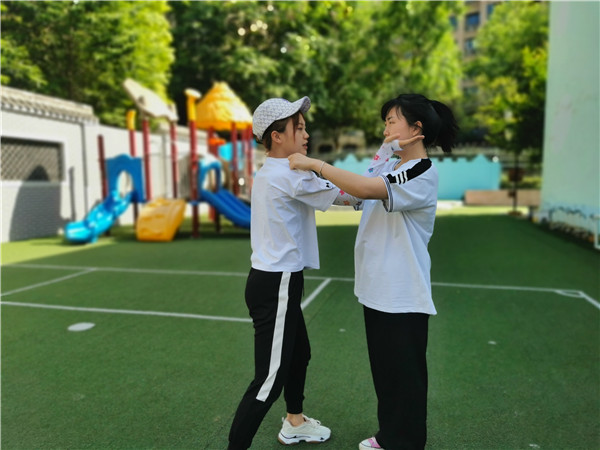 除了排查幼儿园安全隐患,学校特邀大三班陈骏逸的妈妈为教职工提供了专业指导——传授“防身术”。用互动型的示范行为演绎“防范”、“反击”等基本技巧。