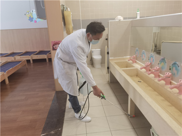 消杀人员对幼儿园园区的教室、厨房、楼梯走廊、公共卫生间、地面、下水道、绿化带等区域进行了全面消杀,确保卫生消杀不留死角、不留盲区。