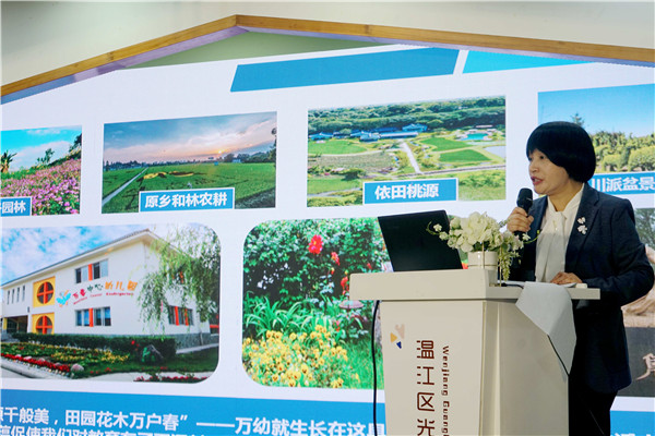成都市温江区万春镇中心幼儿园集团园长彭丽以“自然链接,让资源为课程蓄积内在生长力”为题进行汇报,依托幼儿熟悉的万春本土自然资源,深度整合到园所文化建设中,遵循“尚自然之美,循幼儿之真、蕴教育之善”的课程设计思路,从儿童的本位出发,选择传承中国的二十四节气文化作为园本课程开发的新领域,分享取得的初步成效。