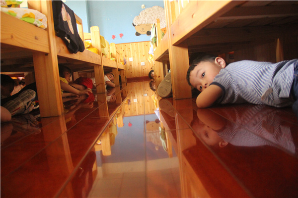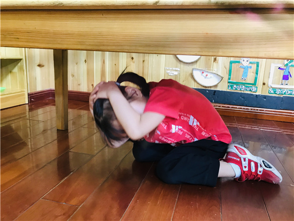 随着第一次警报声在幼儿园内响起——“地震啦,宝贝们,请就近躲避!”老师的话音刚落,孩子们立刻双手抱头,躲在桌下、墙角等区域进行紧急避险。