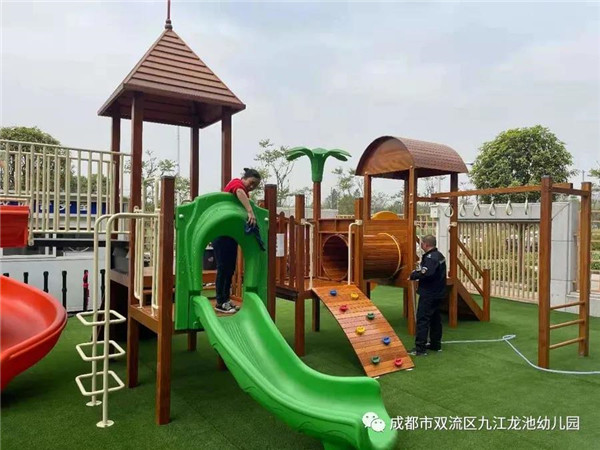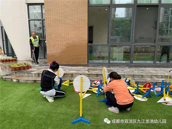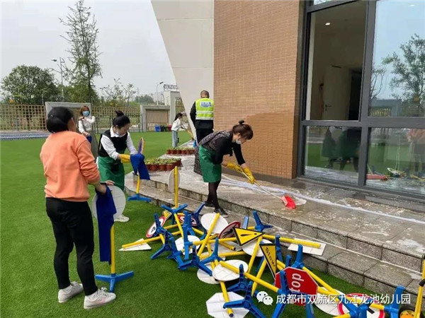 老师们分工明确,准备就绪。在逐一认真清洗完幼儿园各场地后,安保人员和后勤人员也积极做好各场地消毒工作,确保全面清洁消毒到位。