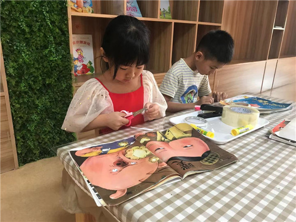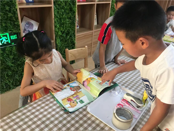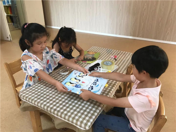 《旧书换新颜》,图书区总有一些书因为损坏被遗忘在角落,小朋友们将他们整理出来进行修补。一本本损坏的图书经过孩子们的耐心修补又恢复如新可以继续阅读了。