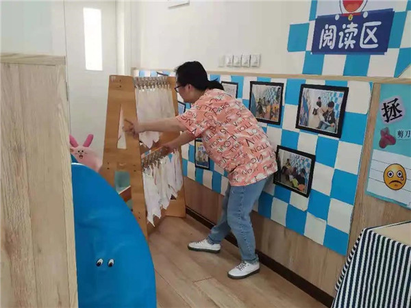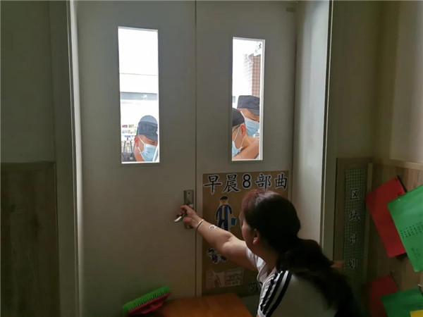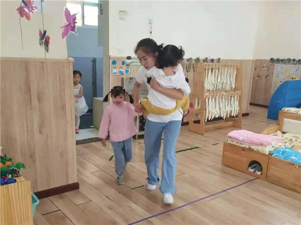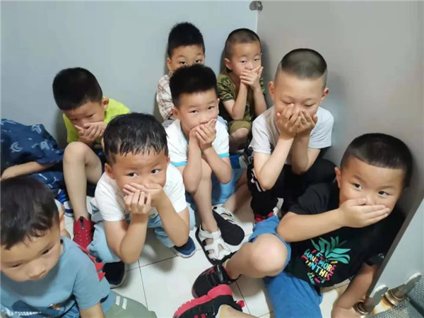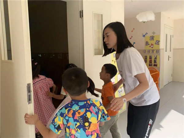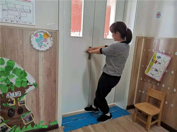 蒙面“歹徒”冲向教学楼,各班教师立即带领各自班级的幼儿进行自我保护,寻找隐蔽的角落躲避,并及时关闭门窗,防止“歹徒”闯入班级,伤害幼儿。