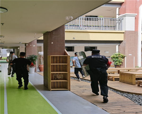 成都市双流区东升迎春幼儿园领导启动应急预案,全园戒备确保全体师生安全。保安人员迅速到位制止“暴徒”。