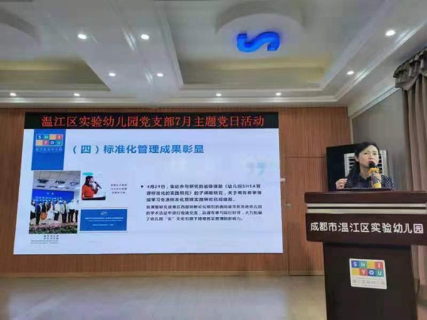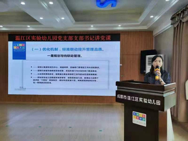 2021年7月7日,温江区实验幼儿园全体教职员工齐聚会议室,聆听了党支部书记彭海霞带来的感党恩,办实事专题党课——《追寻课程建设内涵,提升集团发展品质》。