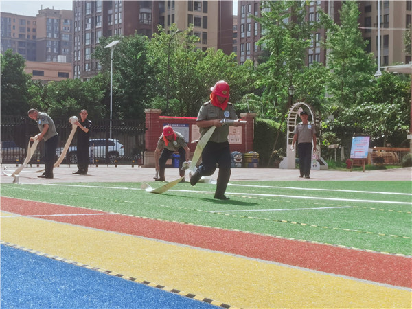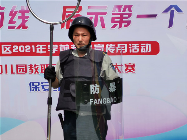 比赛分为安防九件套穿戴、消防打水带以及现场抢答三个部分,保安胡师身穿精神而整齐的制服,不惧危险一身正气,展示着他应对突发安全事故的能力,将为全体教职工和幼儿的安全形成一座安全堡垒。