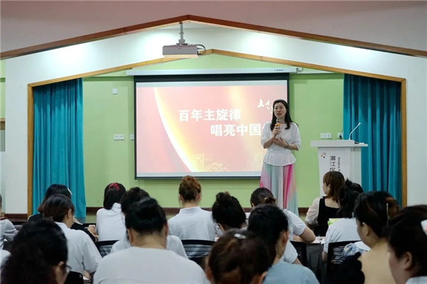 首先,该园党支部书记樊朝霞以“百年主旋律,唱亮中国红”为主题,带领全体教职员工用一首首红歌回顾党的历史征程,铭记党的光辉事迹。