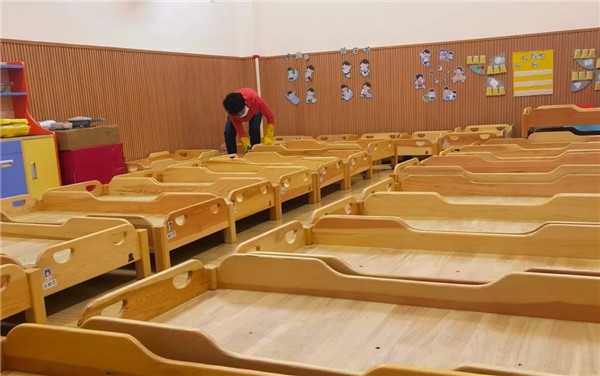 保育人员“按计划、分阶段、严标准”,对班级、大环境、厨房等进行了全覆盖消毒、“四害”消杀和开窗通风,对园所整体环境务求细致、到位、无死角。