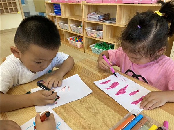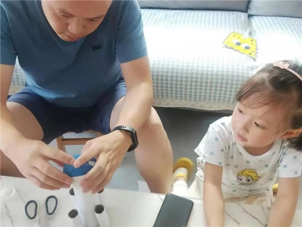 孩子们用各种形式将自己心目中的飞船展示了出来,爸爸妈妈们也用灵活的双手,和孩子们一起造了一艘“神舟十二号”飞船。