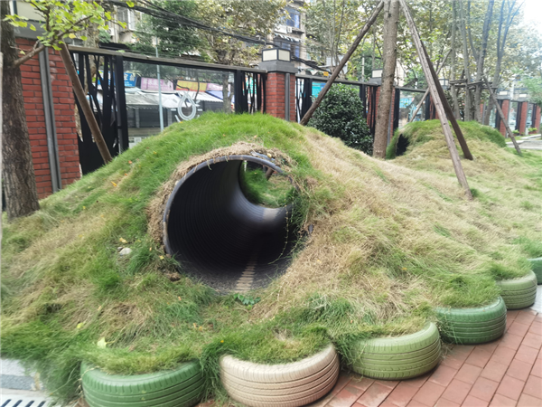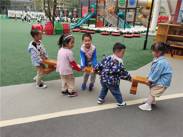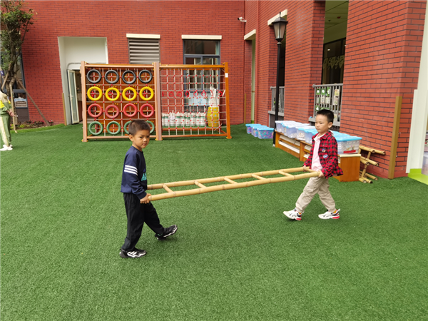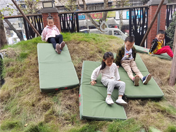 环境也是课程资源,山坡游戏是成都十七幼“生活教育”课程之一,着力于发现每一刻、每一个孩子的精彩。保留自然的小山坡地形,符合低结构要求的环境,与其他户外环境的融合度最高,可以给孩子一些富有趣味的挑战。幼儿发现了山坡不好滑的问题,老师只需有效引导,和孩子们一起讨论,给他们放飞和再创造的机会,身体锻炼自在其中。