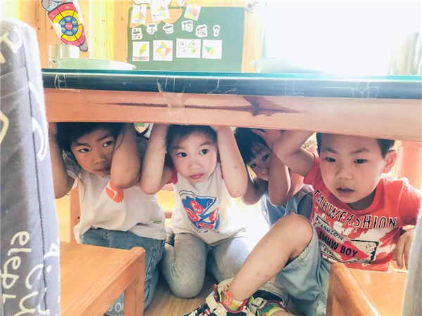 伴随着长达60秒的警报声与“现在地震来袭,实施紧急避险”的现场播报声,老师和小朋友们立刻停止活动,教师迅速发出“现在地震来袭,实施紧急避险”的指令。优先选择在桌子下方进行避险。避险空间不足则用书包或枕头保护头部,在桌(椅)旁下蹲避险。