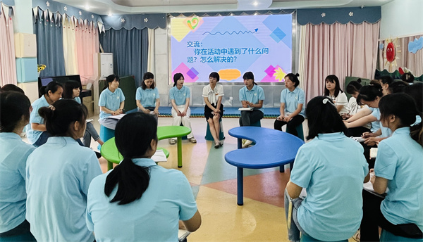有了“大孩子”玩沙的经验,大家对沙水活动有了新的认识。随后,业务园长张云以专业为引领,以“在活动中遇到了什么问题?怎么解决的?在开展班级沙池活动时有什么困惑?如何支持幼儿在沙池中提升建构能力?”等问题进行引导,让教师在由浅入深地思考、交流中产生了思维的碰撞,找到了心中的答案。