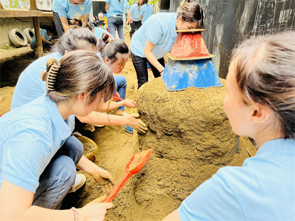 课程游戏化建设要求教师转变角色和思想,成都十九幼教师们也是一群“大孩子”,以童心未泯而又自然乐趣的“体验式探究”的方式探索着“沙子里的秘密”,尝试用不同的办法修建最高的城堡,真正走进儿童的世界,也反思着自身对沙水课程的组织与实施中存在的问题。