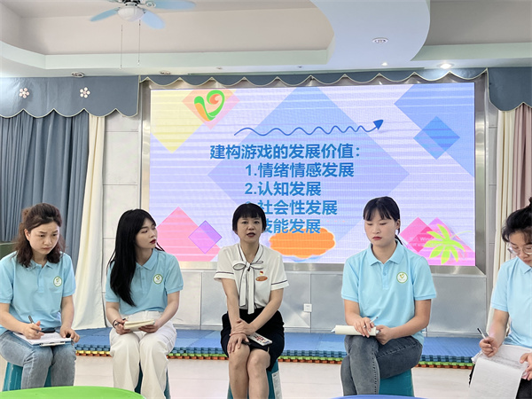 在教师们的深度思考后,业务园长张云再次从“情绪情感、认知、社会性、技能”四方面深入解读了建构游戏的发展价值,并在活跃的谈话交流中帮助教师再次明确了十九幼沙水乐园课程的愿景。