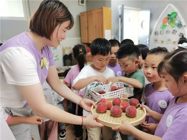 大一班的孩子们把采摘的桃子分享给每一个班级,让幼儿园里的每一个人都一起分享初夏的美味。