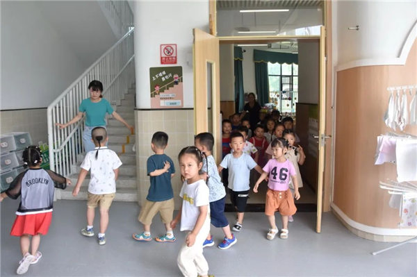 随着警报声响起,各班老师按指定路线由低处往最高点有序撤离。师幼撤离到安全地带后,教师迅速清点人数,安抚幼儿情绪,并向执行园长报告疏散演练情况。