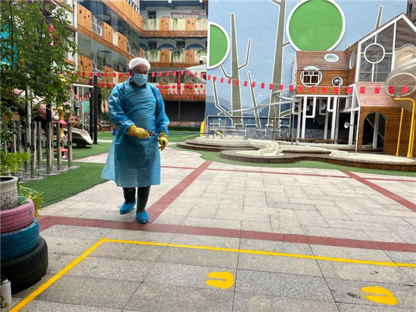 2022年10月7日,成都市第十九幼儿园的“保卫者”们,收起假期的悠闲,对园所进行了全面的消杀。