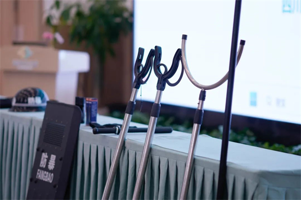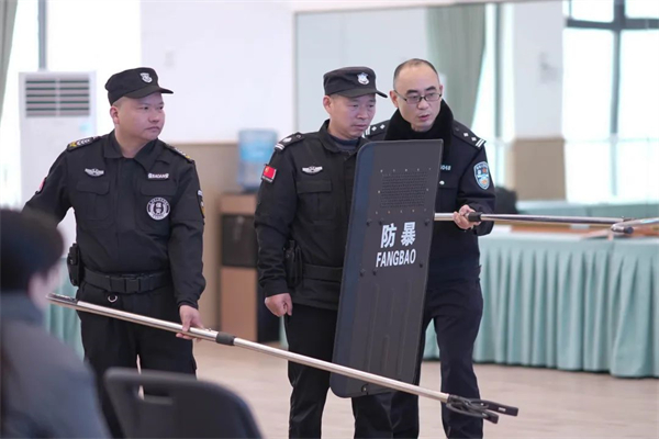 培训活动后,润泽幼儿园开展了反恐防暴应急演练活动。安保小组成员在高警官的指导下迅速利用钢叉、防暴盾等安防装备进行实操演示,齐心协力制服“歹徒”,保障全园师幼的人身安全。