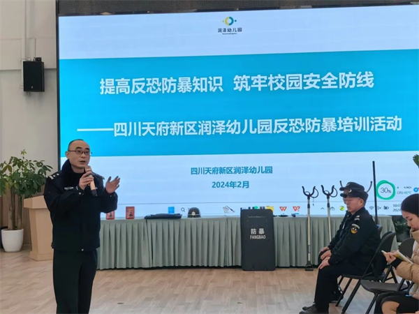 为加强平安校园建设工作,有效防范幼儿园暴力入侵事件,切实增强幼儿园突发事件的综合处置能力,深化幼儿园安全教育,提升园所教职工及幼儿的防暴意识,2024年2月28日上午,四川天府新区润泽幼儿园联动华阳通济桥社区派出所开展了反恐防暴应急处置培训及演练活动。