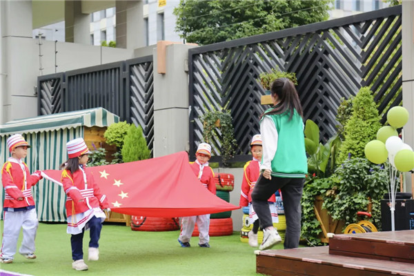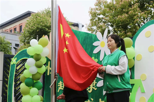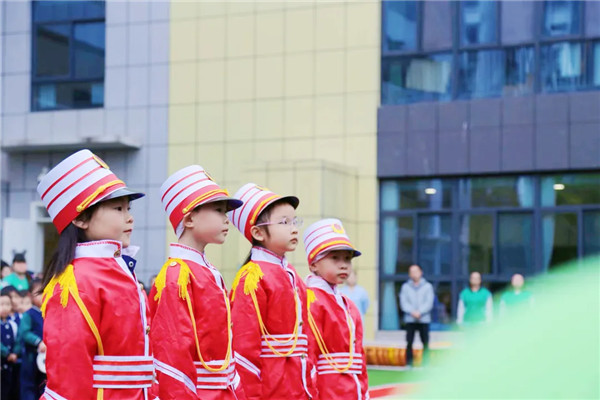 小旗手们迈着铿锵有力的步伐,护送着鲜艳的五星红旗走来……五星红旗缓缓升起,庄严的国歌在操场回荡。