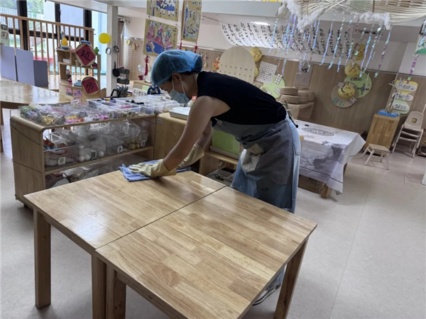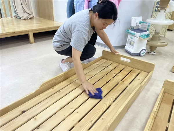 各班保育老师化身“卫生守护者”,聚焦班级内幼儿高频接触的物品,对桌椅、床铺、游戏材料等进行全方位清洗与消毒,确保无卫生死角。清洁后,老师们还对班级物品进行有序摆放,让教室环境既整洁又规整,切实为孩子们打造健康、舒适的“班级小家”。