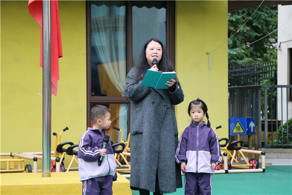 本次升旗仪式由小四班的董佑禾、董安禾家庭主持。“亲爱的老师、小朋友们,大家早上好!”妈妈温柔亲切的问候,与小主持人稚嫩却清晰的声音交织在一起,汇成了仪式现场最独特的温暖和弦。