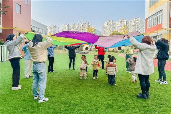 伴随着欢快的节奏,家长和孩子们将彩虹伞和海洋球也变成了一个巨大的爆米花机,孩子们的欢笑声和惊喜的尖叫充满了整个活动。在游戏中不仅锻炼了孩子们的身体协调性,更让亲子关系在欢乐的互动中更加紧密。