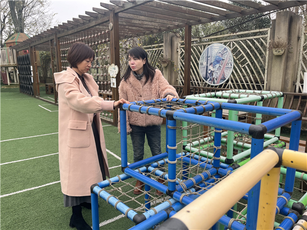 随后,彭海霞实地走访了前后操场,特别对葡萄长廊、攀爬区及大型玩具区进行细致查看,从安全性、趣味性、教育性等多维度进行了专业评估。彭海霞强调,和幼作为以健康为特色的幼儿园,户外环境不仅是运动场所,更是激发幼儿创造力、促进综合发展的游戏场域,而“欢乐足球汇”的混班体能循环优化思路,正是将足球特色、体能发展与混龄社交有机结合的有效尝试,后续可进一步结合户外场地的不同区域特性,把八大动作训练与足球技能、场地资源深度融合,让每一处空间都成为支持幼儿主动游戏、全面发展的活力场。