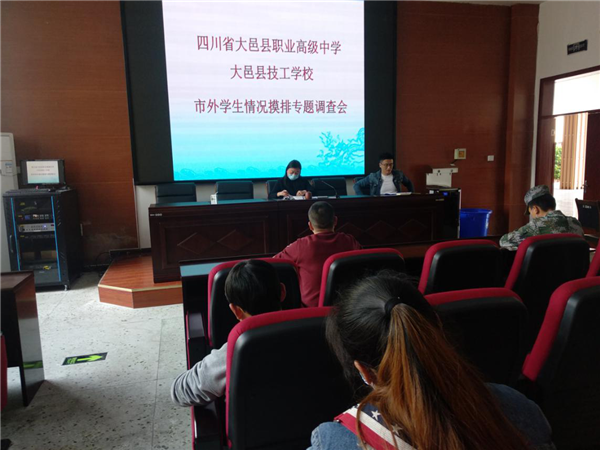 四川教育报道网4月23日讯(记者 张红 通讯员 李攀) 为了进一步落实全校各班市外未返回大成都学生的情况,四川省大邑县职业高级中学于2020年4月17日,在校2号阶梯教室召开学生情况摸排专题调查会,黄渭蓉副校长、德育处副主任郭杰和相关班级班主任参与会议。