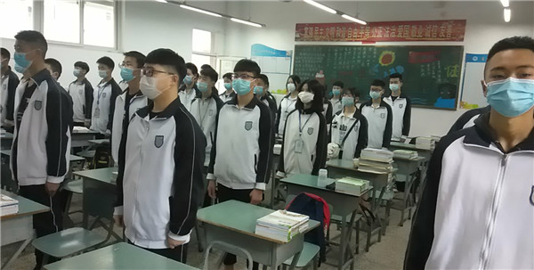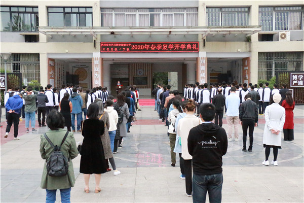 2020年4月21日早上8时40分,四川省大邑县职业高级中学、大邑县技工校2020年春季复学开学典礼准时举行。特殊时期的开学典礼,其形式也以安全为主。每个班级只派一名同学代表到综合楼大厅前参加升旗仪式,其他同学都在教室内面朝黑板上方的国旗站立,国旗手在运动场升国旗,教师们也以间隔一米的距离站立在综合楼大厅。当庄严雄壮的国歌回荡在校园时,全校师生以独特的方式对着国旗行注目礼,感恩着今年来之不及的春季复学。