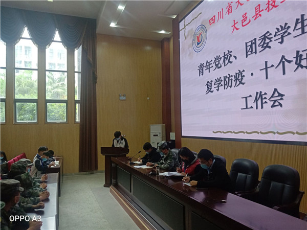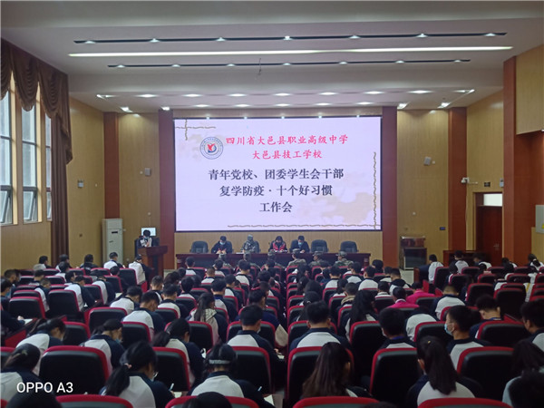 四川教育报道网4月23日讯(记者 张红 通讯员 甘宇翔) 根据复学防疫的工作安排,为认真落实学校复学入校防疫防控工作,加强青年党校、团委学生会干部的防疫意识,推进干部“十个好习惯”,四川省大邑县职业高级中学团委于2020年4月21日中午1点在校一号阶梯教室召开全校干部复学防疫·十个好习惯工作会,德育副校长黄渭蓉,团委书记甘宇翔,团委副书记李攀及教官团队参加了会议。