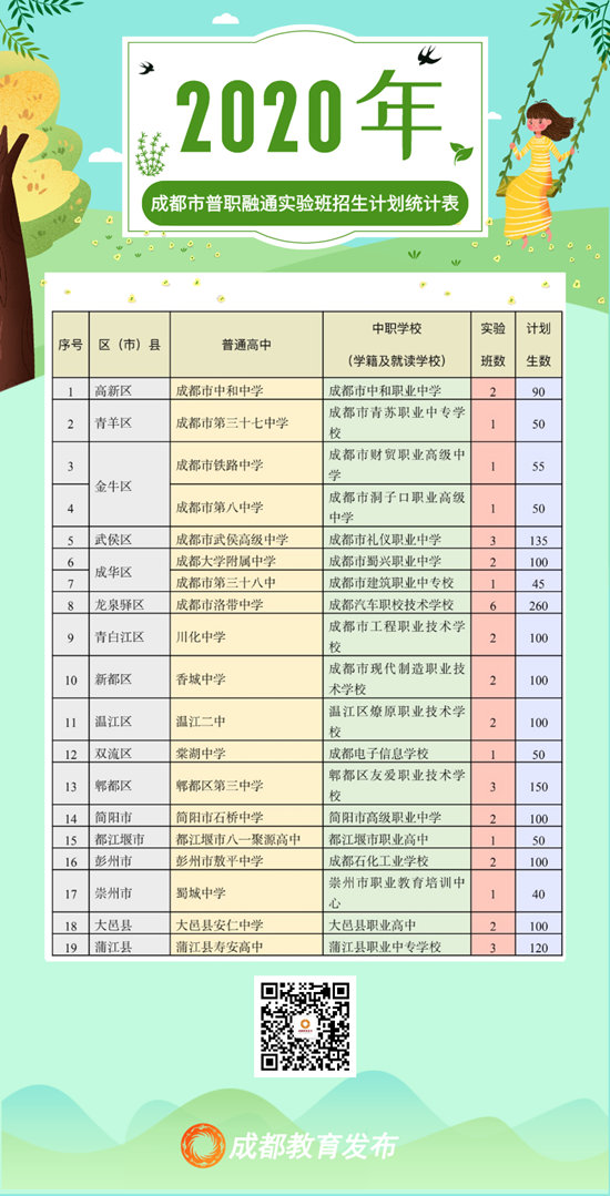 根据《成都市教育局关于推动普职融通育人模式改革的意见(试行)》(成教办〔2017〕11号)实施办法,经各区(市)县教育行政部门审核、报备,成都市中和职中、成都市中和中学等19所中职学校和19所普通高中2020年举办普职融通实验班,并按公布的招生计划招生。