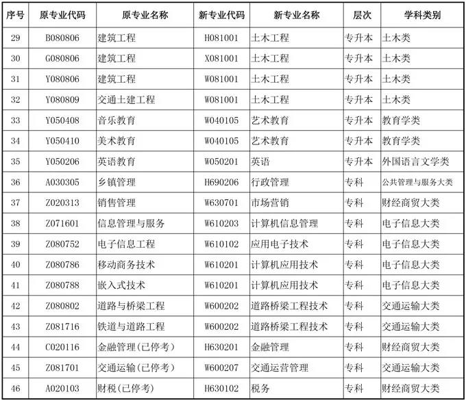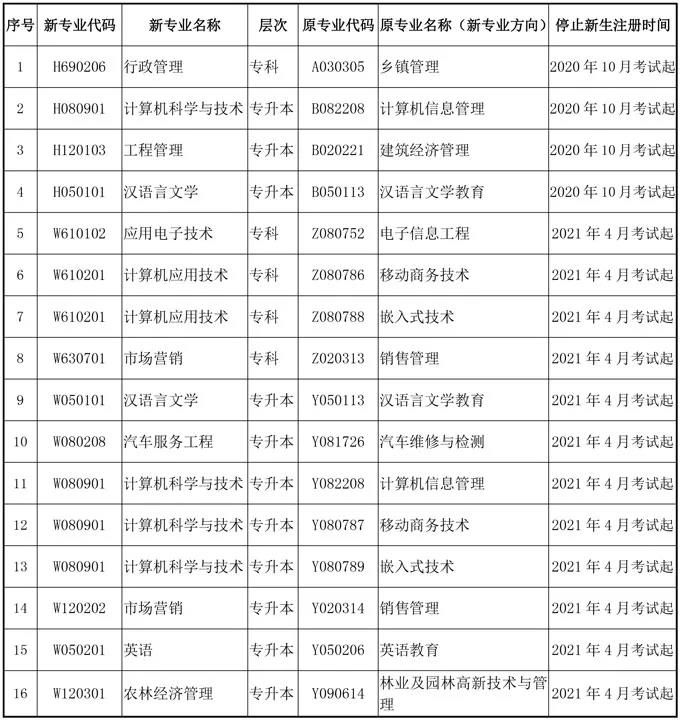 本次调整后,行政管理(专科,乡镇管理方向)等4个专业方向从2020年10月考试起停止新考生报名注册,应用电子技术(专科,电子信息工程方向)等16个专业方向从2021年4月考试起起停止新考生报名注册。