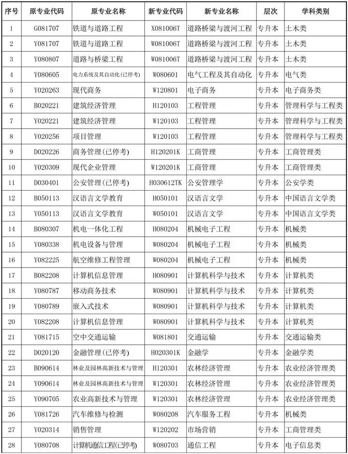 按照教职成厅〔2018〕1号文件要求,进一步推进四川省专业名称及代码调整、规范工作,从2021年1月起铁道与道路工程等46个专业按照调整后的专业名称及代码执行。调整后与《普通高等学校本科专业目录(2012年)》《普通高等学校高等职业教育(专科)专业目录(2015年)》《高等学历继续教育补充专业目录》的专业名称和代码、学科分类一致。专业课程设置仍沿用《四川省高等教育自学考试专业考试计划汇编》(2016年版)原专业的相关规定执行。