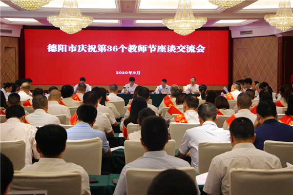 2020年9月8日,德阳市庆祝第36个教师节座谈交流会在旌湖宾馆会议厅隆重举行。德阳市委常委、宣传部部长吴成钢,市委副秘书长谢正伦,市教育工委书记、市教育局党组书记、局长屈直出席会议。会议由德阳市委宣传部常务副部长、市新闻出版局局长赵仕圣主持。