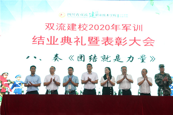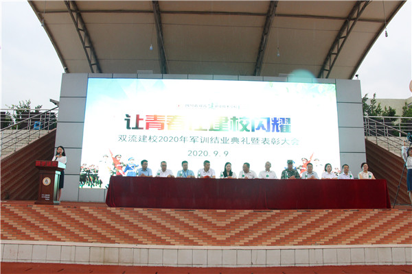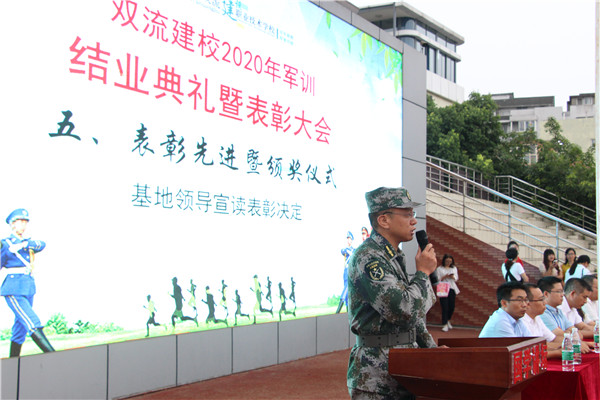 9月9日,双流建设职业技术学校(以下简称:双流建校)2020年全员军训结业典礼暨表彰大会在学校运动场隆重举行。成都市国防教育基地领导王杰,双流建校党支部书记、副校长周小研,党支部副书记辜松柏,教学副校长杨俊松等领导及全体师生和军训教官参加了典礼。典礼由学校团委书记陈嫱主持。
