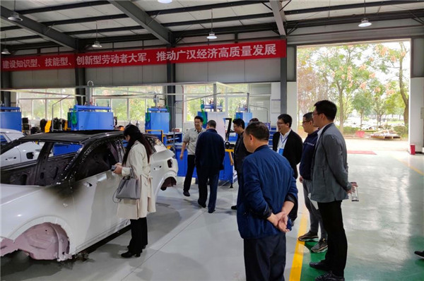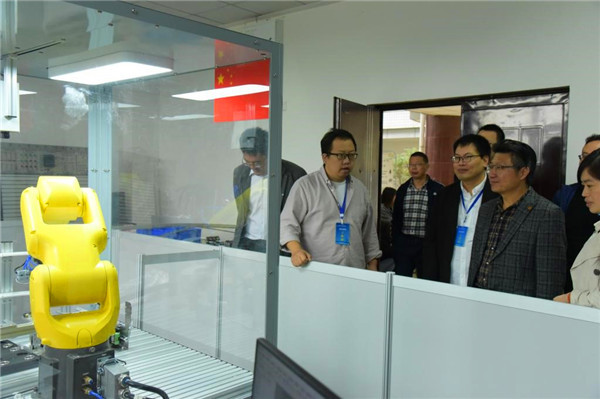戚炎陪同胡文钧一行参观了学院的实习厂、汽车实训中心、焊接实训中心、上汽大众高技能人才联合培训中心及工业机器人实训室。