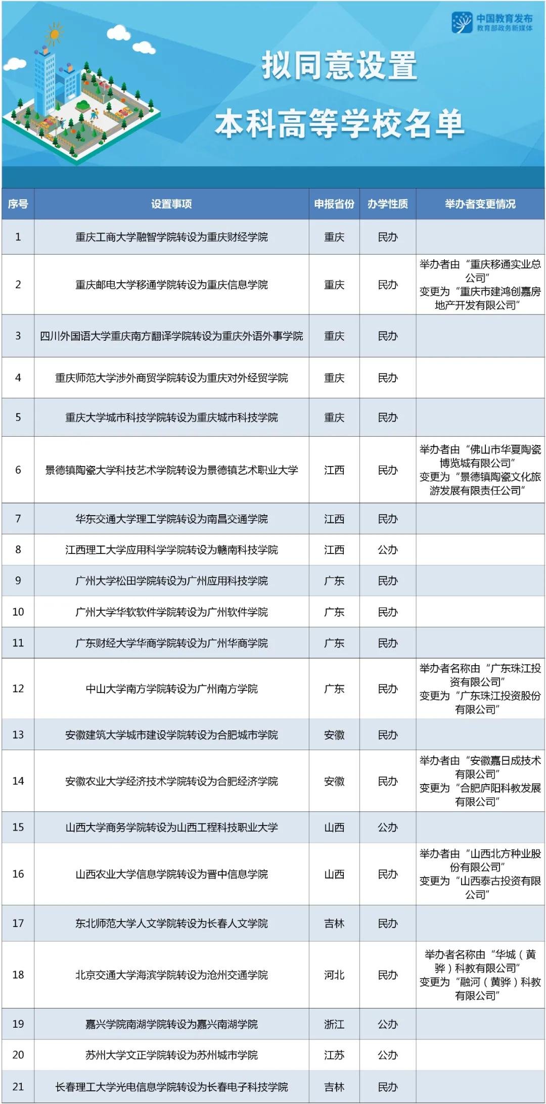 公示指出,根据《高等教育法》《普通高等学校设置暂行条例》《普通本科学校设置暂行规定》和《关于加快推进独立学院转设工作的实施方案》等法律法规政策规定,经第七届全国高等学校设置评议委员会专家考察和评议,并经党组会审议,拟同意重庆工商大学融智学院等21所独立学院转设为独立设置的本科学校,现将学校名单等信息向社会公示。公示时间为2020年11月11日至11月25日。