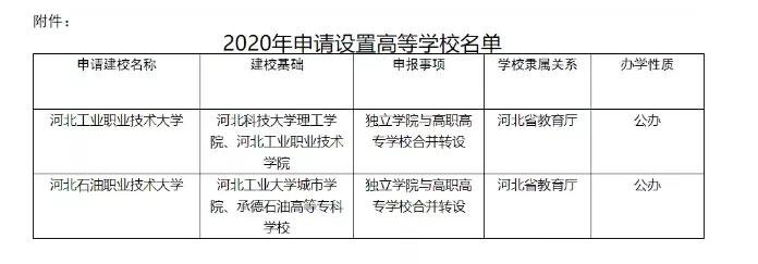 10月10日,河北省教育厅发布《关于2020年高等学校设置事项的公示》,河北科技大学理工学院、河北工业大学城市学院2所独立学院的转设事项已通过省级评估。向社会进行公示。