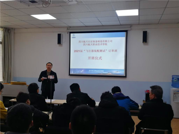 四川航天长征装备制造有限公司第一事业部副部长、10车间主任冯建新,人力资源处副处长张弛,四川航天职业技术学院副院长戚炎、校企合作处处长古中林、飞行器系主任周林出席此次开班仪式。