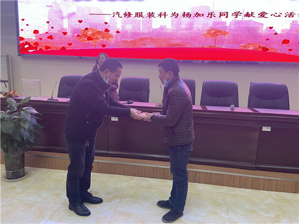 聚沙成塔,聚水成涓。本次活动共筹得善款5566元,由汽服科科长现场交到受伤同学父亲手里。愿这份饱含师长关爱和同学们满满祝福的善款能帮助受伤同学擦去伤痛的泪水,克服暂时的难关,早日康复返校,与同学们一起快乐学习,健康成长。
